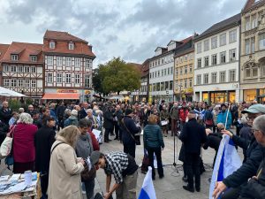 Am frühen Morgen des 07. Oktober 2023 überfielen Terrorgruppen der Hamas in Israel Kibuzzim, Städte und das elektronische Musikfestival Nova. Während der von der Hamas so bezeichneten „Al-Aksa-Flut“ wurden wahllos mehr als 1.200 Israelis ermordet und über 200 Geiseln genommen und in den Gaza Streifen verschleppt. Es handelt sich um das größte Pogrom an Juden seit dem Holocaust. Auf dem Marktplatz vor dem Alten Rathaus gedachten gestern Abend ca. 350 Göttinger*innen der Opfer und der immer noch verschleppten Geiseln. Eröffnet wurde die Gedenkveranstaltung mit der israelischen Nationalhymne und dem Entzünden von Kerzen für die Opfer. Mehrere Redner*innen bekundeten ihre Solidarität mit Israel und erinnerten an die besondere Verantwortung Deutschlands.