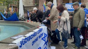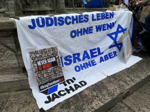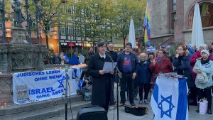 Die Landtagsabgeordnete der Grünen Marie Kollenrott wies auch auf das Kriegsleid der Palästinenser hin und forderte dazu auf, sich gegen jede Form von Hass zu engagieren. Nach dem „Kaddisch“ Gebet endete die Veranstaltung. Am Rand des Rathausmarkts gab es stille Proteste von Gegendemonstranten die palästinensische und libanesische Flaggen schwenkten und Transparente hochhielten. Auszüge aus den Reden und einen ausführlichen Bericht über die Veranstaltung bringen wir am Freitag in unserer Sendung „Die Woche kompakt“ um 17:35 Uhr.