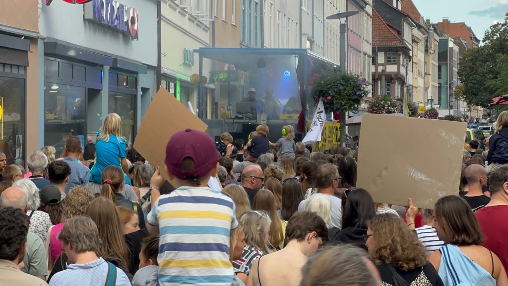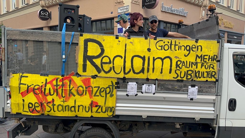 Der Rave hatte natürlich auch einen ernsten Hintergrund, die Kultur steht aufgrund der massiven Einsparungen unter einem starken Druck. Bei einer Zwischenkundgebung auf dem Marktplatz vor dem Alten Rathaus gab es dazu Reden von Vertreter:innen des Deutschen Theaters und Reclaim Göttingen: