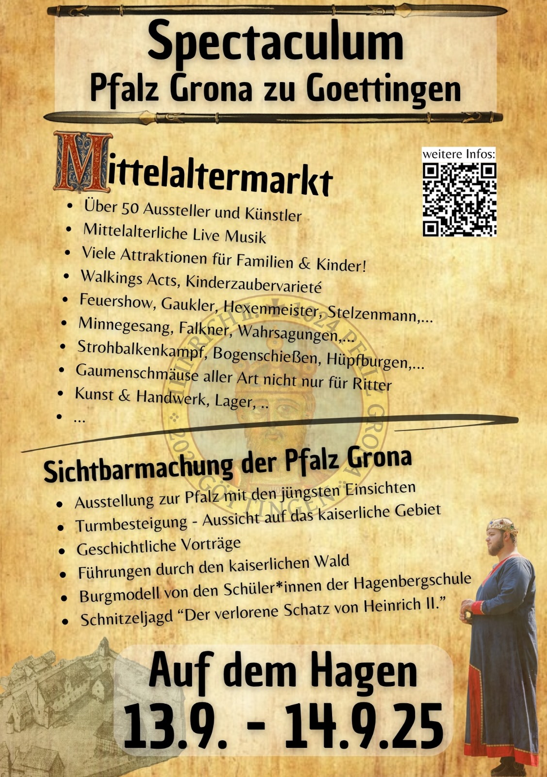 Am morgigen Sonntag, dem 14. September 2025, findet auf dem Hagenberg in Göttingen der zweite Tag des Mittelalterfests „Spectaculum Pfalz Grona“ statt. Das familienfreundliche Event bietet bei freiem Eintritt eine Zeitreise ins Jahr 1024 n. Chr., als König Heinrich II. auf der Pfalz Grona verstarb.