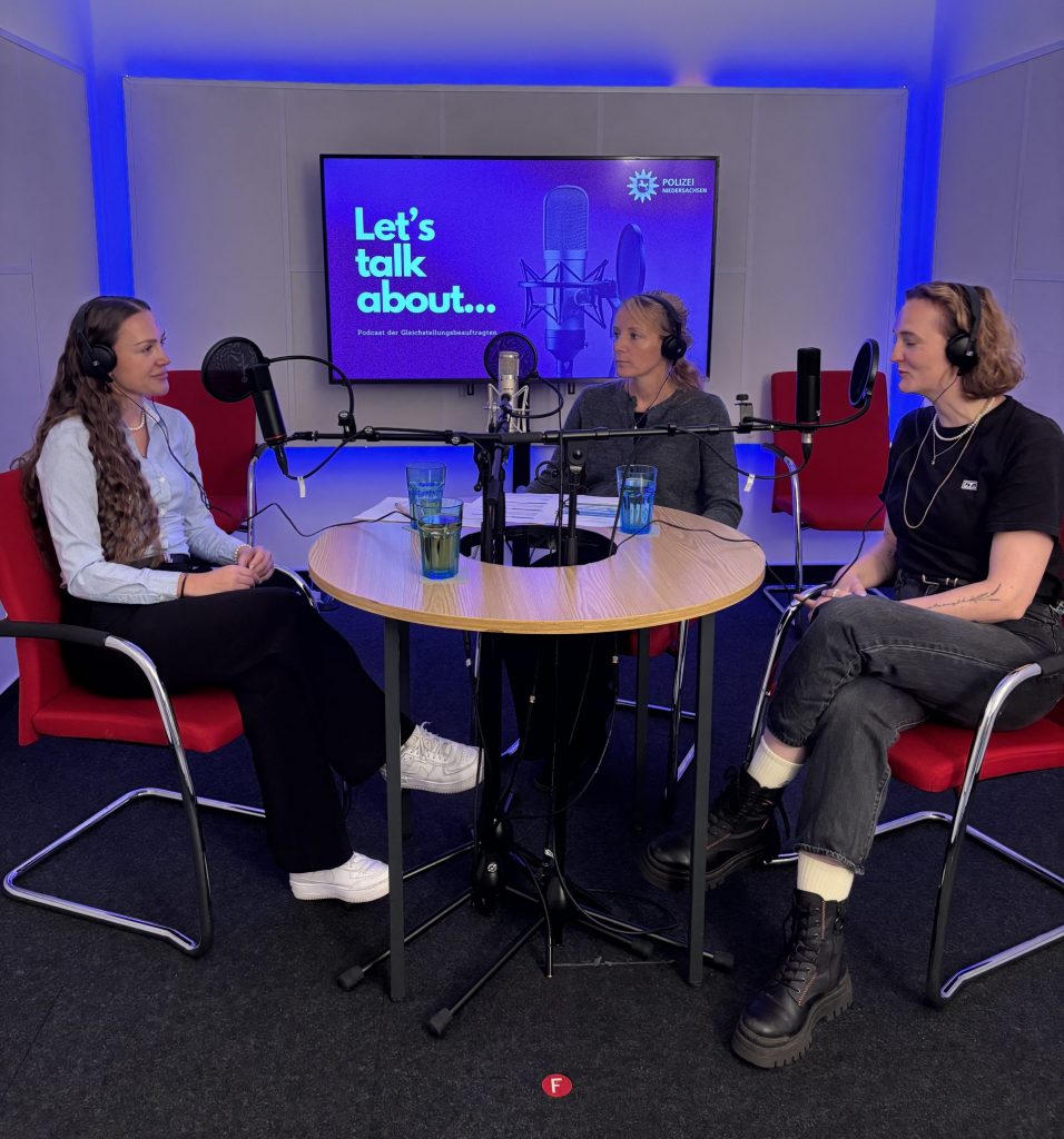 Foto: Aufnahme des Podcasts „Let’s talk about“ (von links): Hanna Paschenko von der Polizei Nienburg/Schaumburg, Gleichstellungsbeauftragte Stefanie Wattenberg und Podcasterin Isabell Moss. ©Polizeidirektion Göttingen